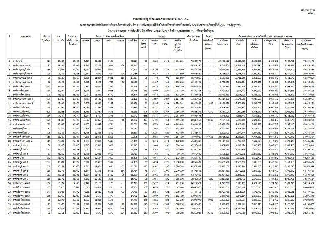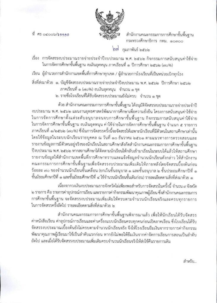 เมื่อวันที่ 1 มีนาคม 2562 สำนักนโยบายและแผนการศึกษาขั้นพื้นฐาน สำนักงานคณะกรรมการการศึกษาขั้นพื้นฐาน ได้เผยแพร่ข้อมูลเรื่อง การจัดสรรงบประมาณรายจ่ายประจำปีงบประมาณ พ.ศ. 2562 กิจกรรมการสนับสนุนค่าใช้จ่ายในการจัดการศึกษาขั้นพื้นฐาน (งบเงินอุดหนุน) ภาคเรียนที่ 1 ปีการศึกษา 2562 (70%) โดยมีเนื้อหารายละเอียดและไฟล์แนบดังนี้ครับ