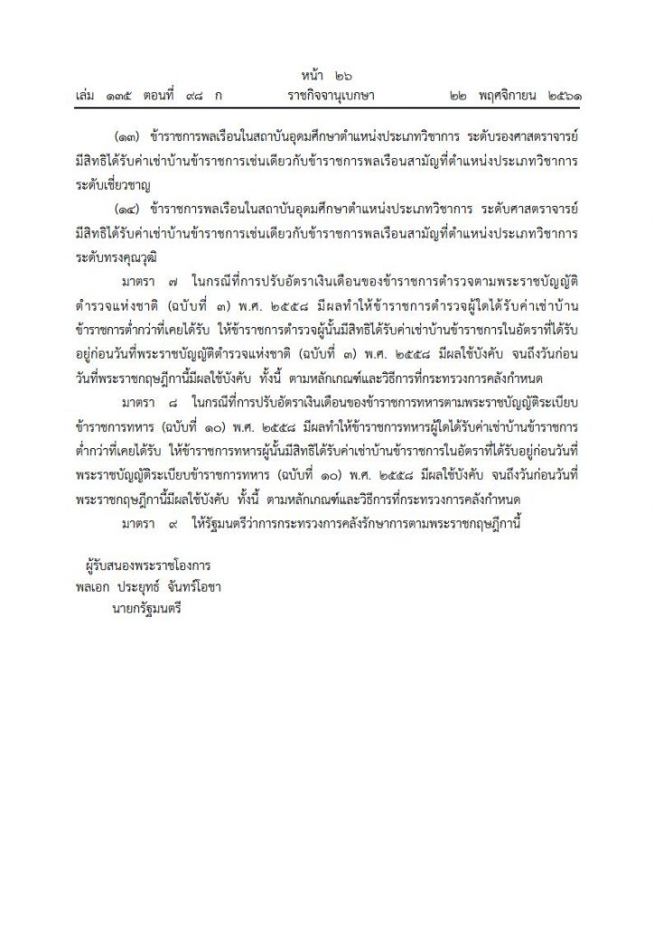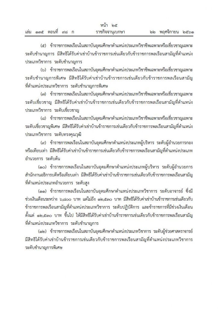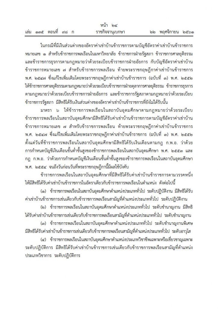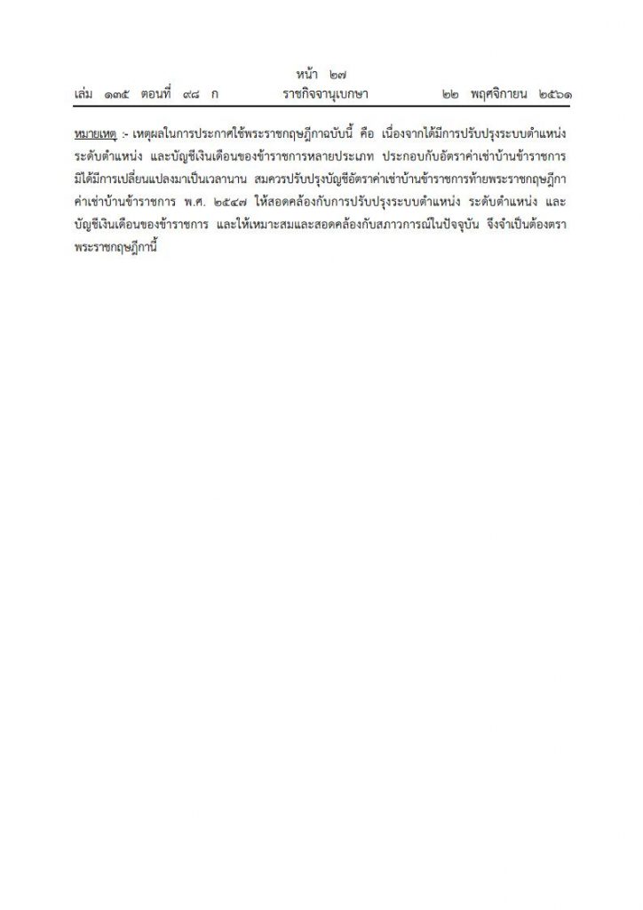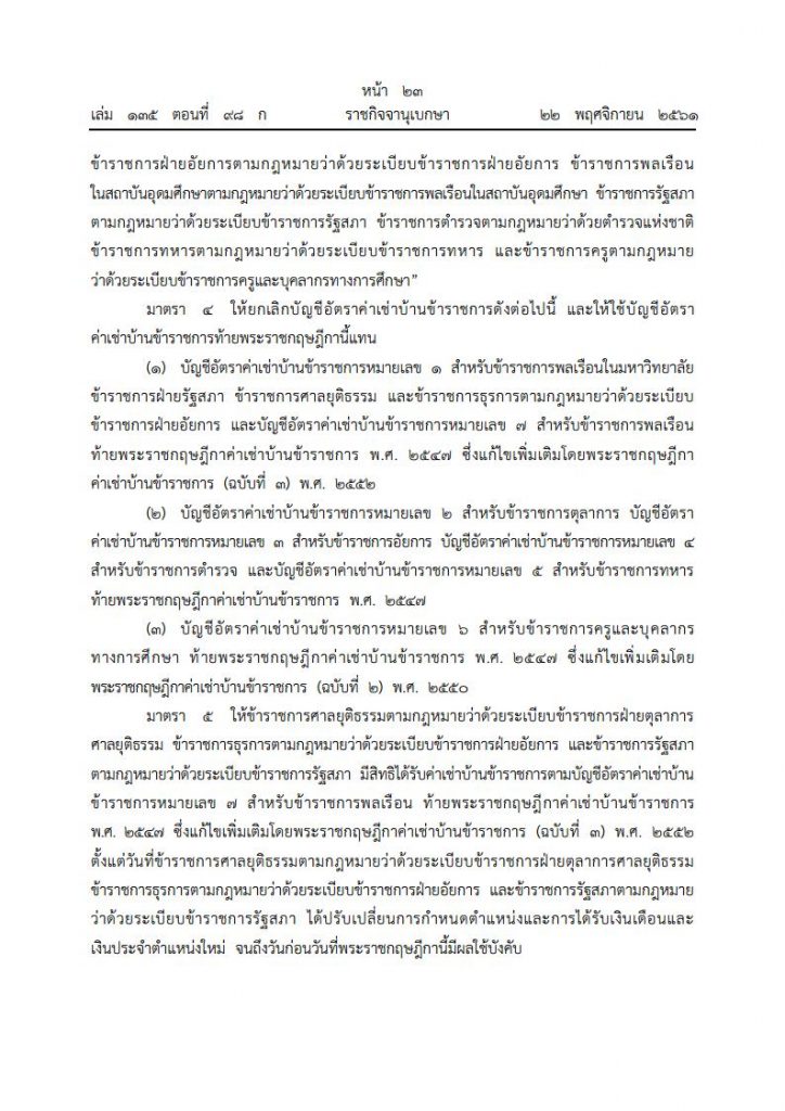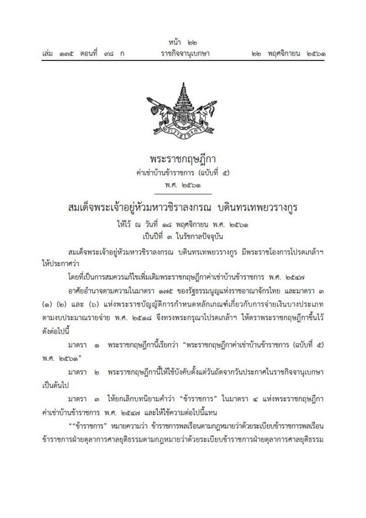 เมื่อวันที่ 22 พฤศจิกายน 2561 เว็บไซต์ราชกิจจานุเบกษา ได้เผยแพร่ พระราชกฤษฎีกาค่าเช่าบ้านข้าราชการ (ฉบับที่ 5) พ.ศ. 2561