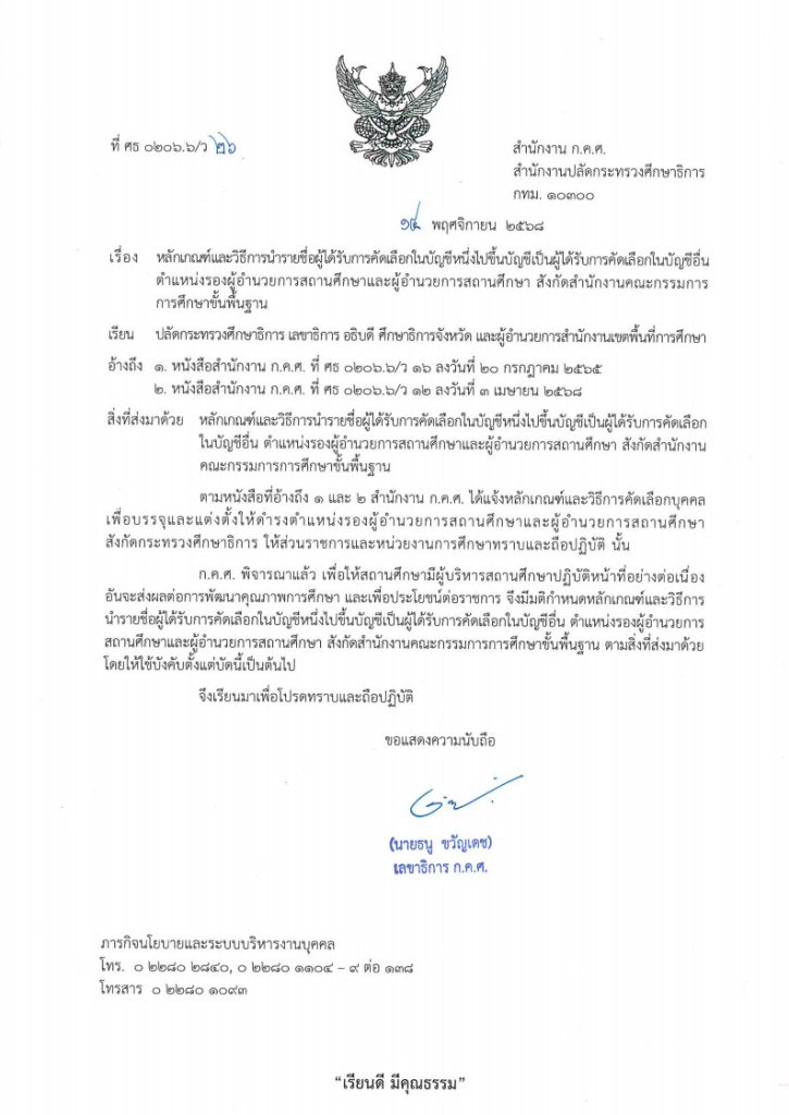 ว 26/2568 ลงวันที่ 14 พฤศจิกายน 2568 ก.ค.ศ. ออกหลักเกณฑ์และวิธีการขอยืมบัญชี ในตำแหน่งรองฯ / ผอ.สถานศึกษา
