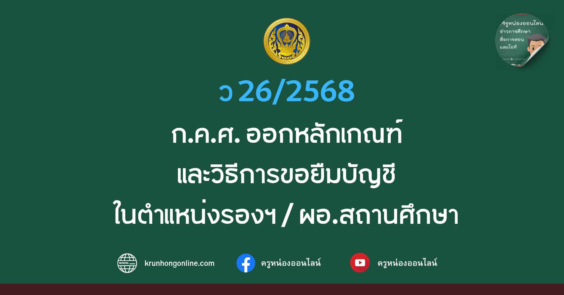 ว 26/2568 ลงวันที่ 14 พฤศจิกายน 2568 ก.ค.ศ. ออกหลักเกณฑ์และวิธีการขอยืมบัญชี ในตำแหน่งรองฯ / ผอ.สถานศึกษา