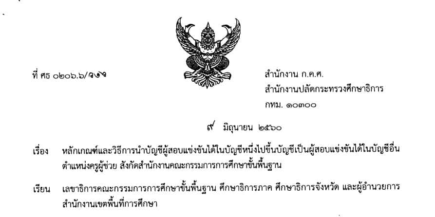 ว16/2560 หลักเกณฑ์และวิธีการ นำบัญชีผู้สอบแข่งขันได้ในบัญชีหนึ่ง ไปขึ้นบัญชีเป็นผู้สอบแข่งขันได้ในบัญชีอื่น ตำแหน่งครูผู้ช่วย