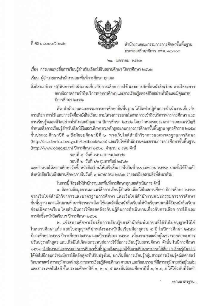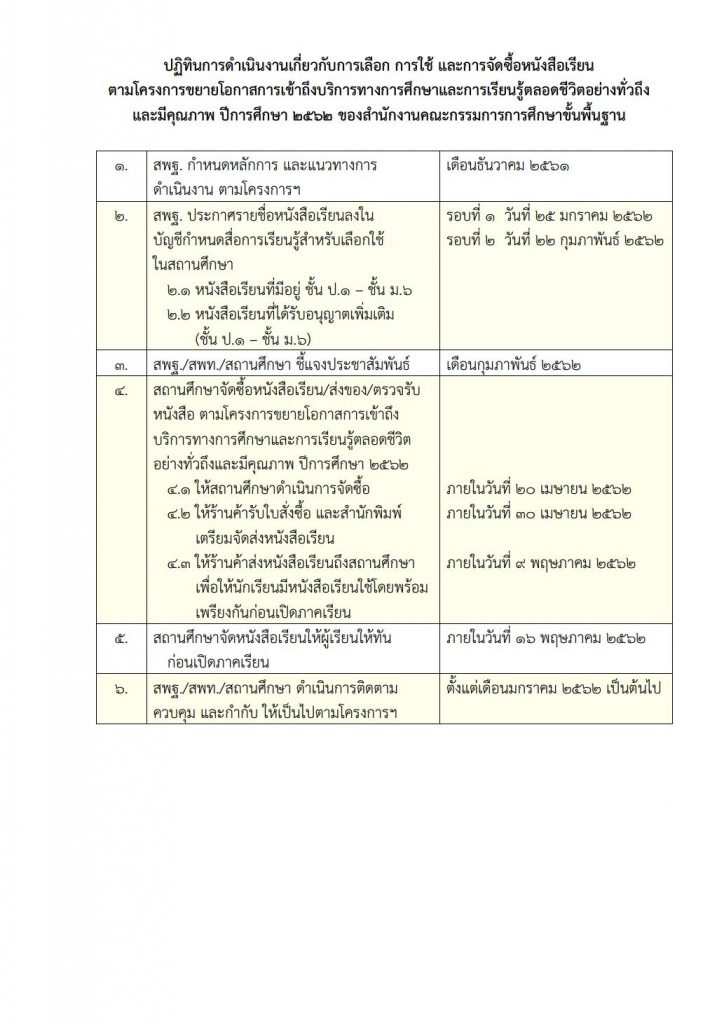 ด้วยสำนักงานคณะกรรมการการศึกษาขั้นพื้นฐาน ได้จัดทำปฏิทินการดำเนินงานเกี่ยวกับการเลือก การใช้ และการจัดซื้อหนังสือเรียน ตามโครงการขยายโอกาสการเข้าถึงบริการทางการศึกษา และการเรียนรู้ตลอดชีวิตอย่างทั่วถึงและมีคุณภาพ ปีการศึกษา ๒๕๖๒ โดยกำหนดระยะเวลาการเผยแพร่บัญชีกำหนดสื่อการเรียนรู้สำหรับเลือกใช้ในสถานศึกษา ตามหลักสูตรแกนกลางการศึกษาขั้นพื้นฐาน พุทธศักราช ๒๕๕๑ ชั้นประถมศึกษาปีที่ ๑ ถึงมัธยมศึกษาปีที่ ๖ ทางเว็บไซต์สำนักวิชาการและมาตรฐานการศึกษา (http://academic.obec.go.th/textbook/web) และเว็บไซต์สำนักงานคณะกรรมการการศึกษาขั้นพื้นฐาน (http://www.obec.go.th) ปีการศึกษา ๒๕๖๒ จำนวน ๒ รอบ ดังนี้